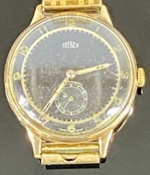 TREBEX VINTAGE 9CT GOLD CASED GENT'S WRISTWATCH, black dial with Arabic numerals and subsidiary seconds dial, 35mms (diam.), on gilt metal expanding braceletProvenance: private collection Gwynedd