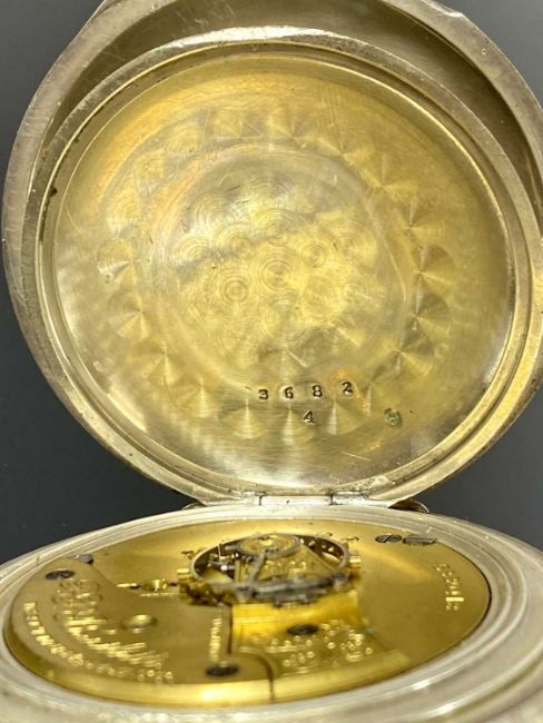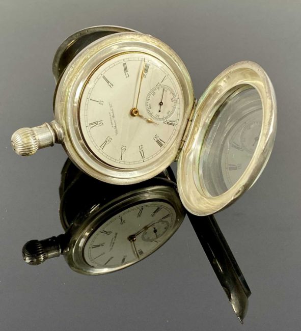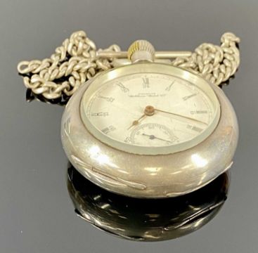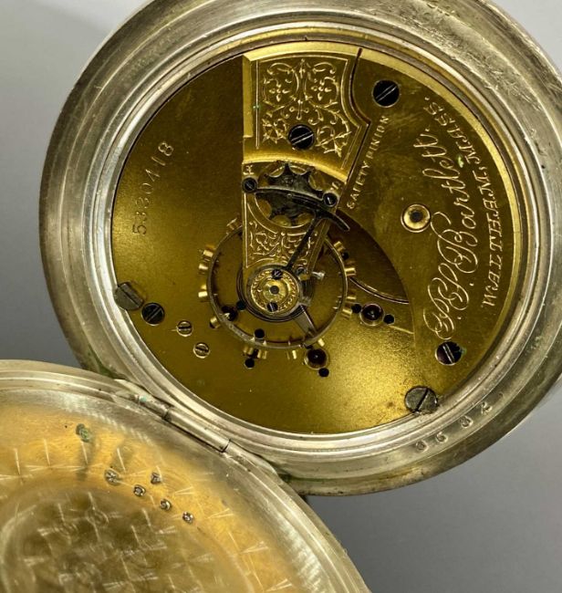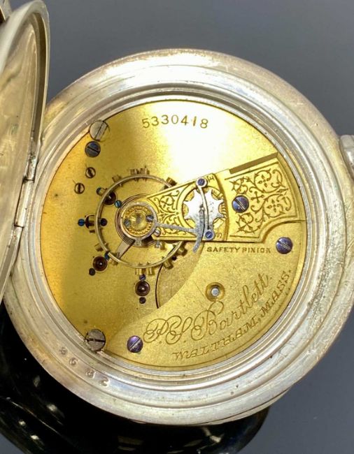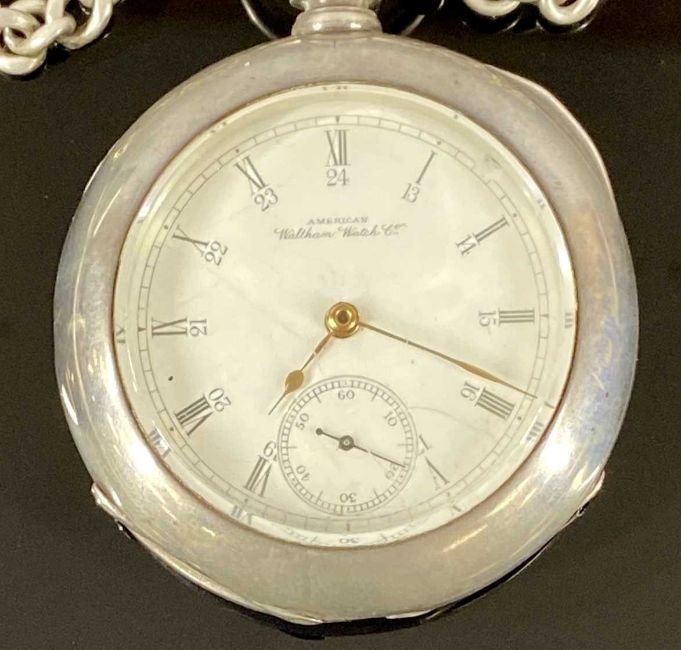 BARTLETT WALTHAM WATCH CO. LARGE NICKEL CASED POCKET WATCH, keyless, white dial with subsidiary seconds dial, movement signed and numbered 5330418, 60mms (diam.), with a silver watch chain with T-barProvenance: private collection Gwynedd
