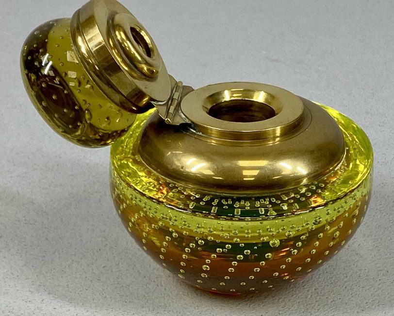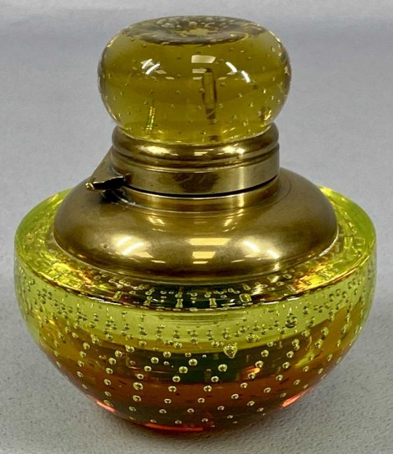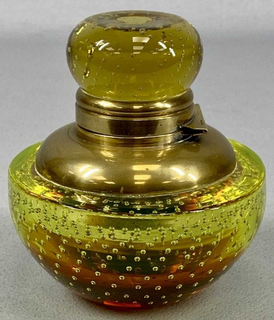 WHITEFRIARS CONTROLLED BUBBLE INKWELL in green and amber glass, squat oval form with gilded brass mounts, 11cms (h)Provenance: private collection Ynys Môn