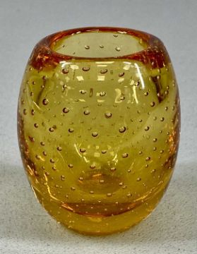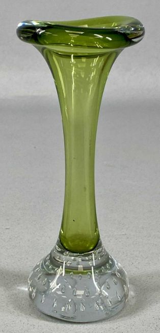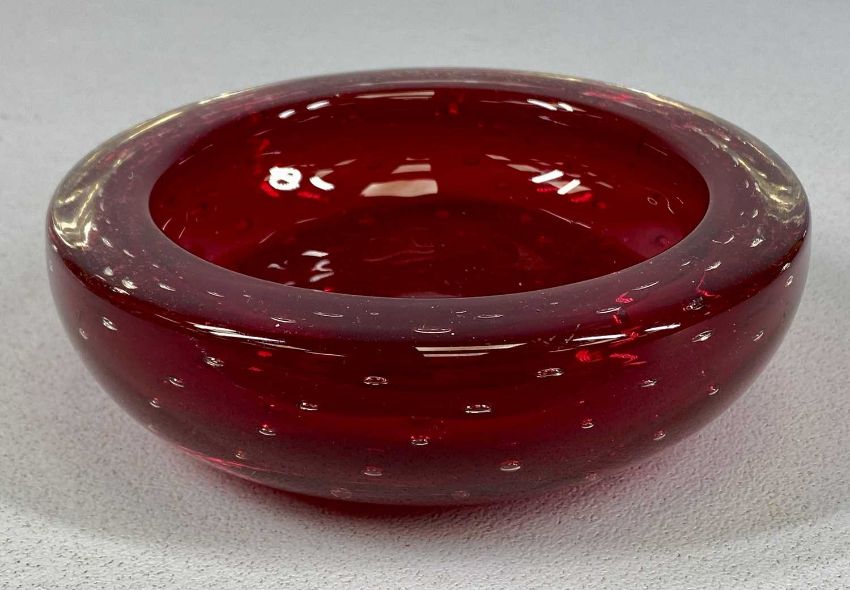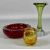 WHITEFRIARS CONTROLLED BUBBLE GLASSWARE, comprising amber glass vase, 7cms (h); red and clear glass ashtray, 15cms (h); and green glass bud vase with clear base, 16cms (h)