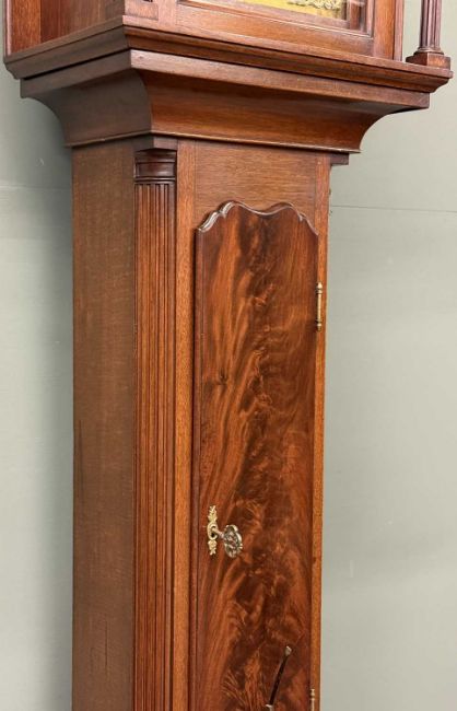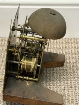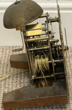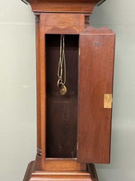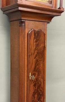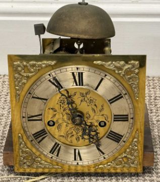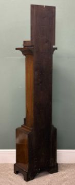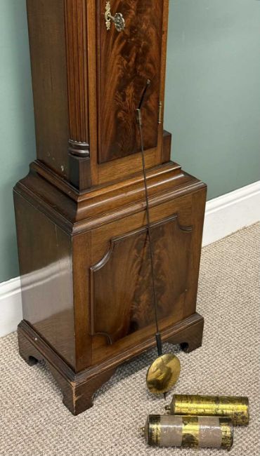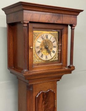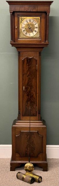 REPRODUCTION MAHOGANY DWARF LONGCASE CLOCK, 20cms brass dial with pierced spandrels, silvered chapter ring with Roman numerals, 8-day movement striking on a bell, case having shaped door flanked by reeded quarter columns, with pendulum and twin weights, 171 (h) x 45 (w) x 28cms (d)Provenance: private collection Shropshire