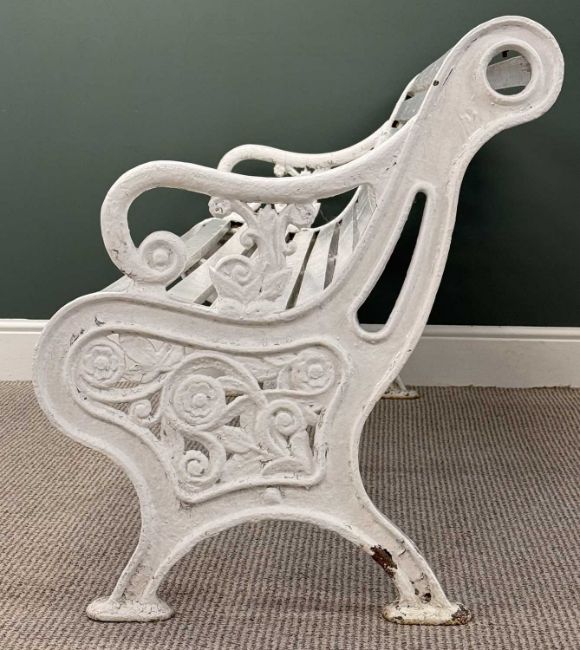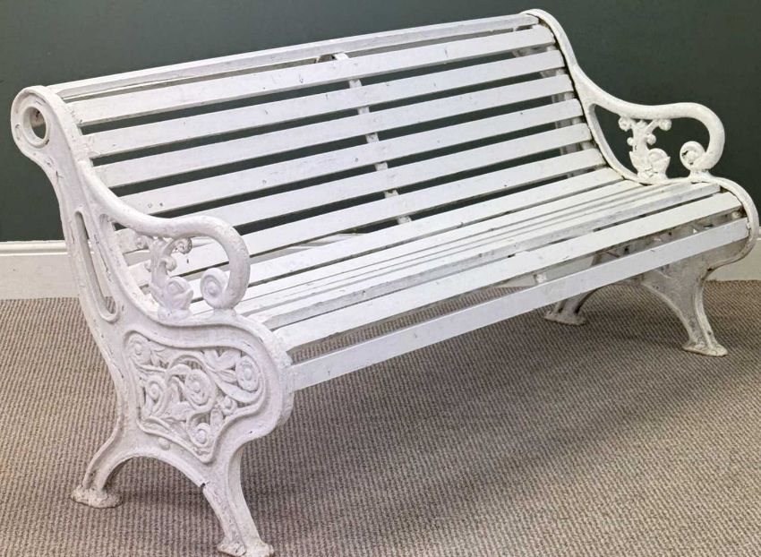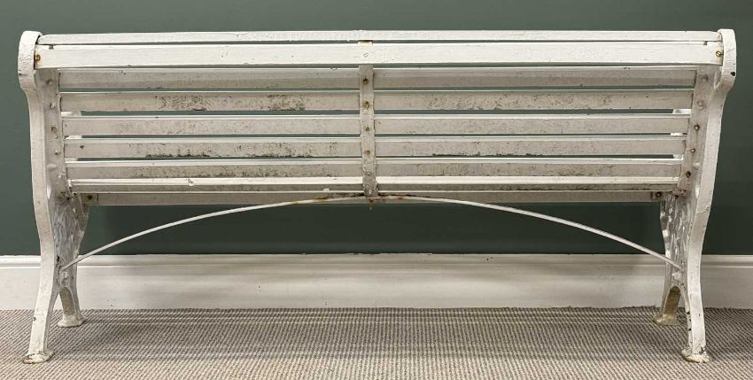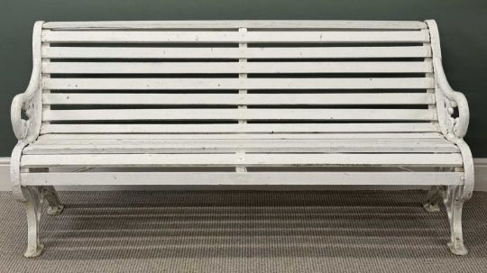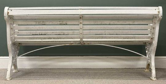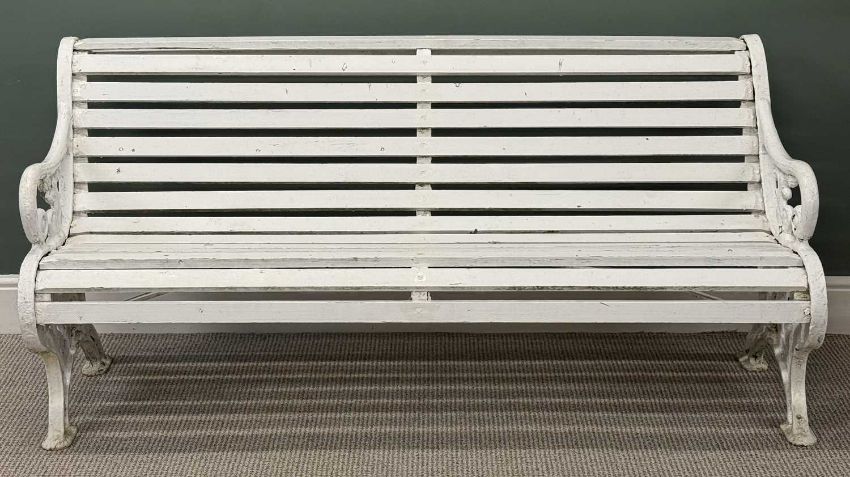 VICTORIAN GARDEN BENCH with substantial cast iron scroll ends, wooden slatted seat and back, painted white, 82 (h) x 172 (w) x 75cms (d)Provenance: private collection Conwy