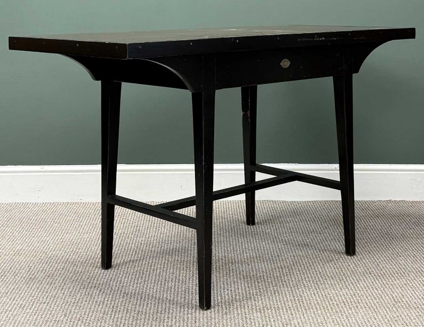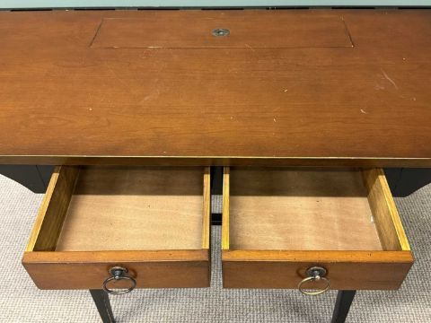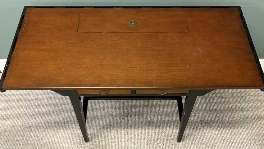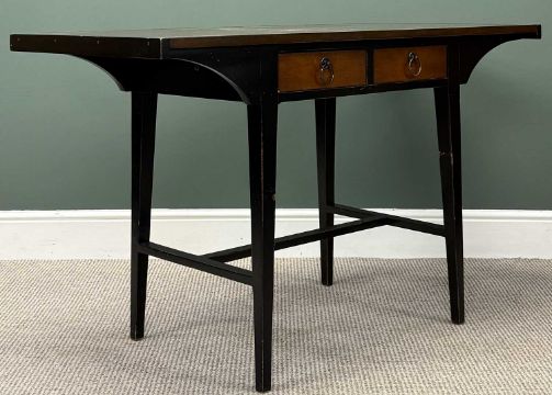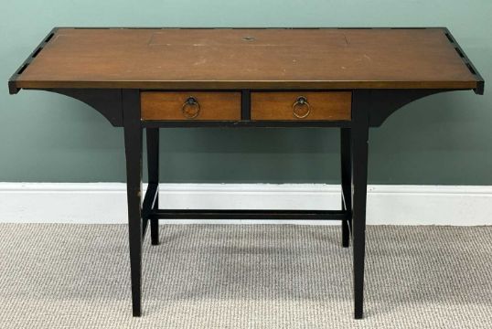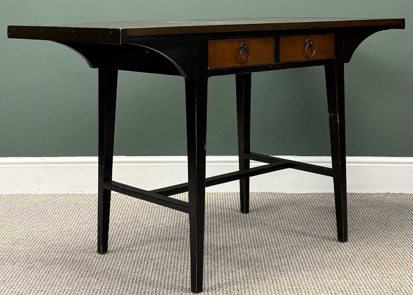 PER MARE PER TERRAM CONTEMPORARY DESK, rectangular top having compartment with recessed ring handle, two drawers with ring handles, ebonised base and mounts, 79 (h) x 131 (w) x 60cms (d)Provenance: private collection Conwy