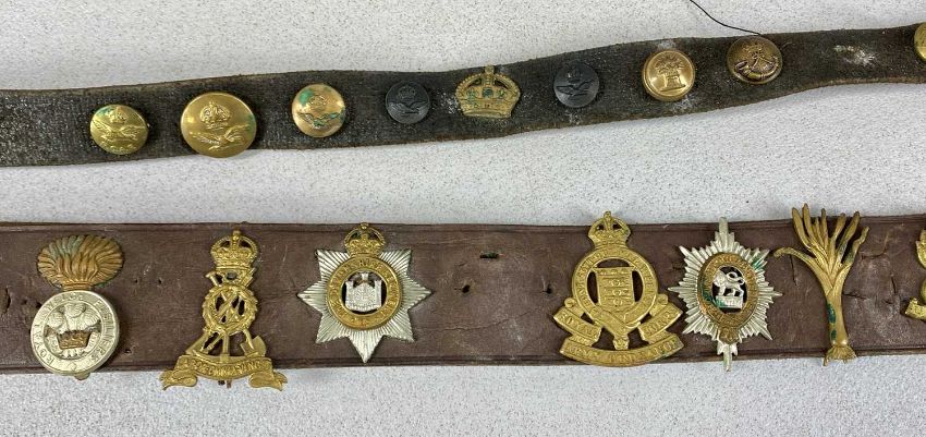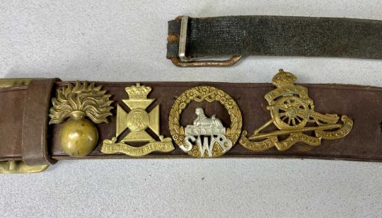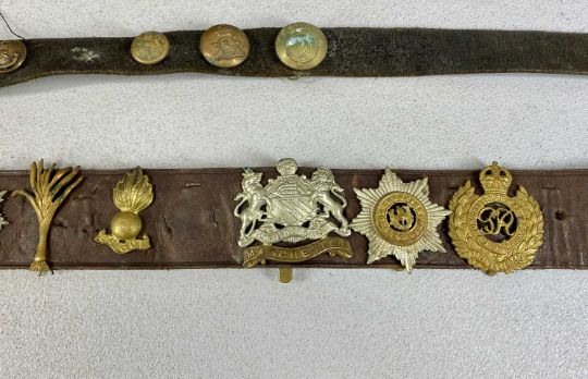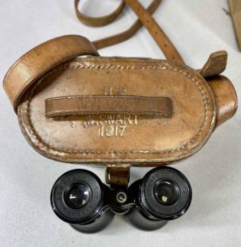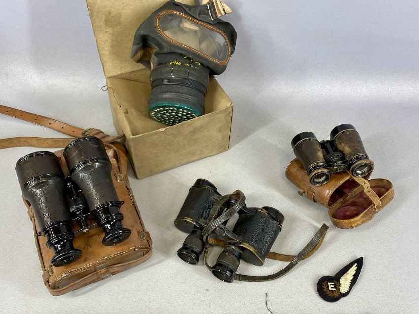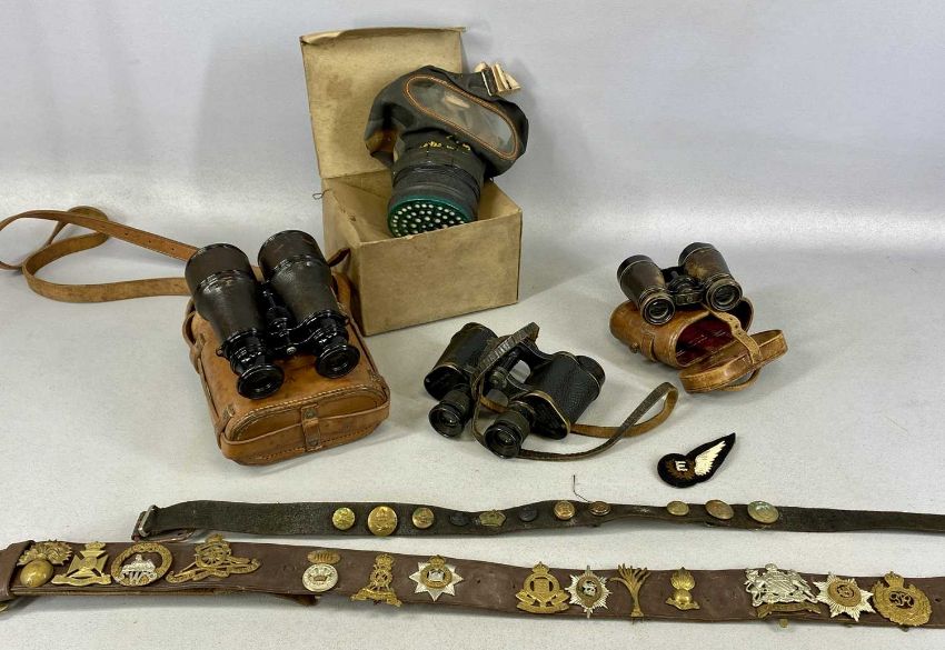 MILITARIA, including pair of French made binoculars in leather case stamped with military arrow, W Swart 1917; leather belt mounted with British military cap badges; WWII Lancashire County Council respirator, etc.Provenance: private collection Conwy
