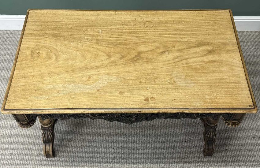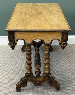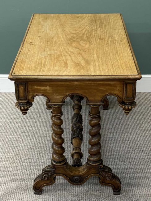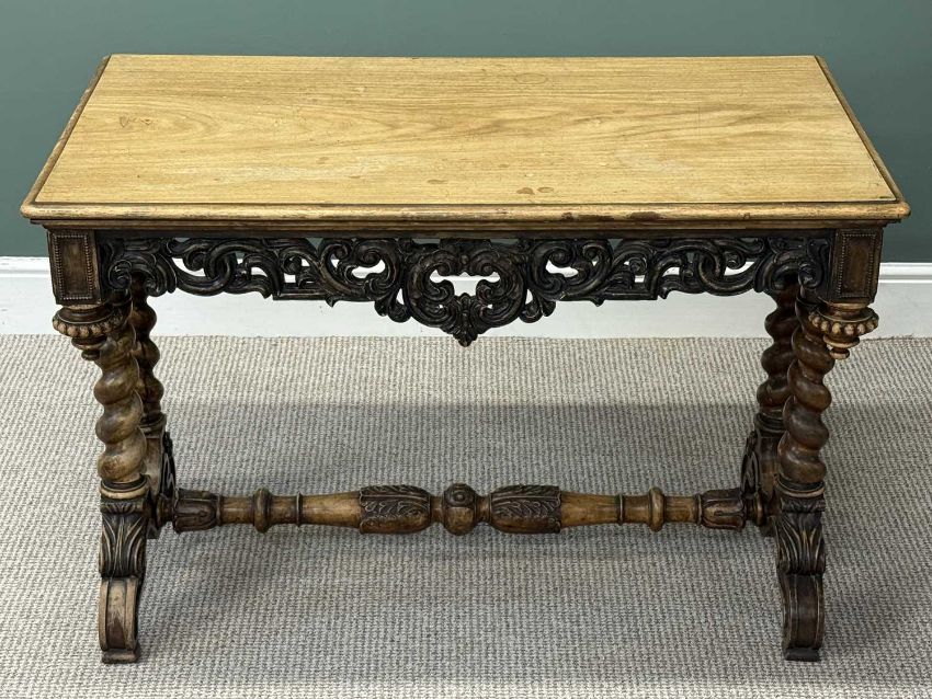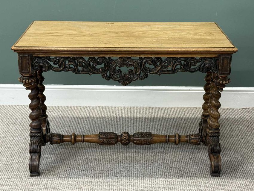 VICTORIAN WALNUT LIBRARY TABLE, rectangular top with moulded rim and rounded corners, over carved and pierced apron with inverted finials, barley twist end supports to the carved scrolled feet, united by an acanthus carved stretcher, 75 (h) x 112 (w) x 64cms (d)Provenance: private collection Gwynedd