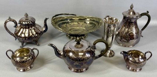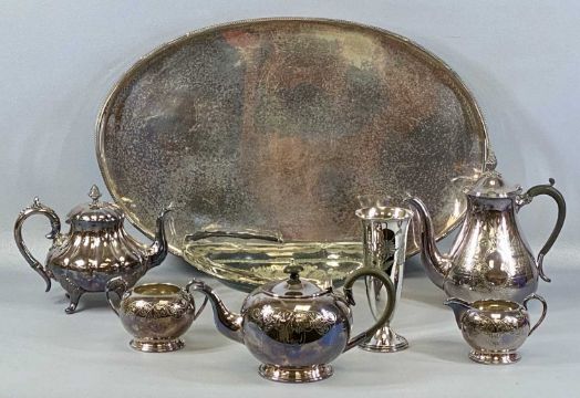 ASSORTED PLATED WARE, including large oval Sheffield plate tea tray with pierced gallery rim, oval EPNS cake basket with swing handle, three-piece EPBM tea set, etc.Provenance: private collection Conwy