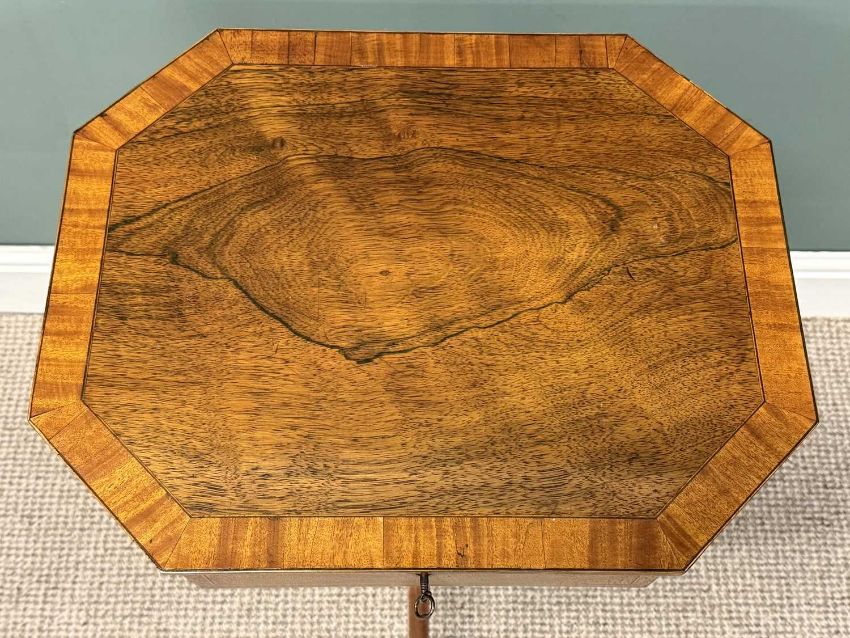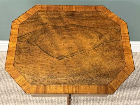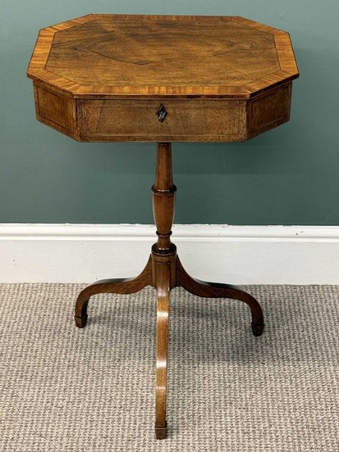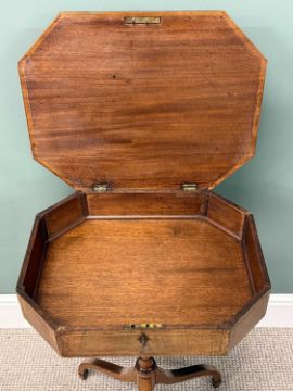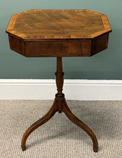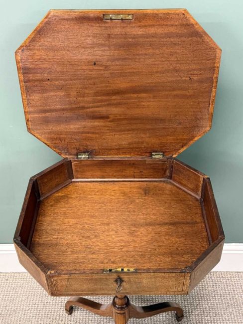 19TH CENTURY ROSEWOOD & MAHOGANY SEWING TABLE, octagonal hinged lid, turned column to the down swept tripod supports, 71 (h) x 47 (w) x 38cms (d)Provenance: private collection Shropshire