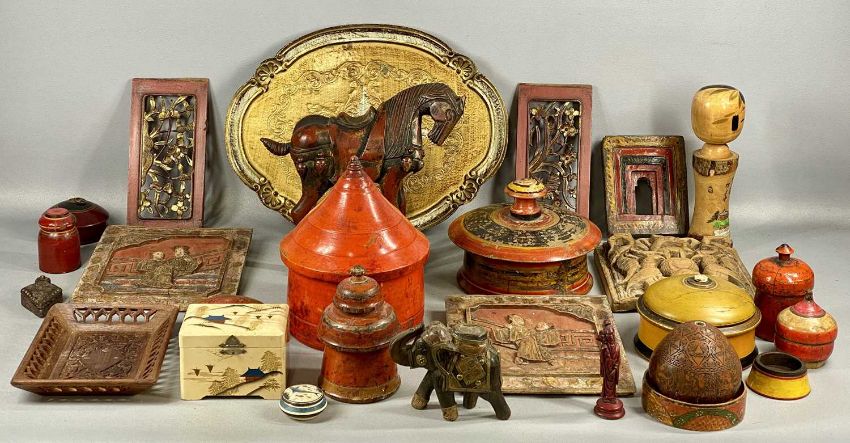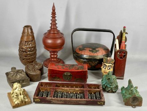 LARGE ASSORTMENT OF INDONESIAN, ASIAN & OTHER DECORATIVE WOODEN ITEMS, mostly painted, including an abacus; Chinese lacquered basket with cover, 30cms (h); various boxes; Tang style lacquered wooden horse, 17cms (diam.), etc.Provenance: private collection Ynys Môn