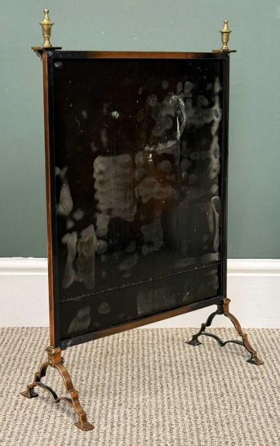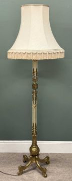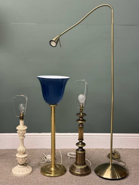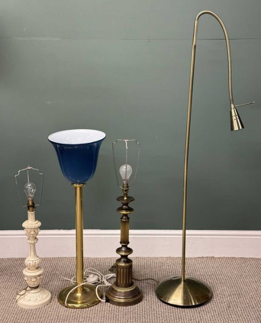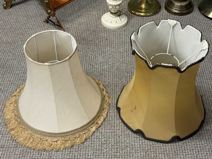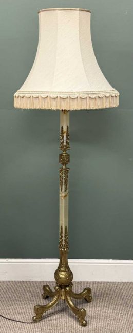 DECORATIVE FURNISHINGS PARCEL, including ornate gilt metal and onyx standard lamp with fringed fabric shade, 70cms (h); copper fire screen with brass mounts, 68 x 48cms; modern adjustable brass reading lamp, 135cms (h); and three other table lampsProvenance: private collection Shropshire