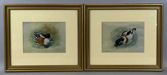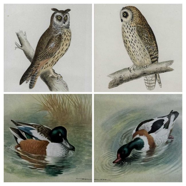 ‡ ALEXANDER FRANCIS LYDON (British, 1836-1917) pair of hand-coloured lithographs - 'Long-eared Owl' and 'Short-eared Owl', c. 1870, 21 x 13cms; and BASIL EDE (British, 1931-2016) pair of colour prints - mallards, 14 x 19cms (4)Provenance: private collection Ynys MônComments: lithographs in period maple frames, glazed; prints framed and glazed
