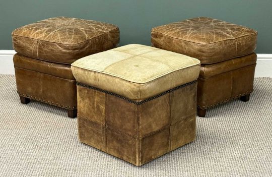 THREE BROWN HIDE UPHOLSTERED SQUARE POUFFES, a pair, and one other having studded detail, 44 (h) x 46cms²Provenance: private collection Conwy