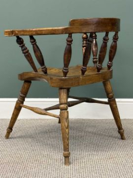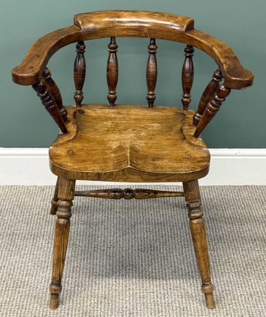 ELM SMOKER'S BOW ARMCHAIR, spindle back, outswept arms, shaped solid seat, turned supports and stretchers, 77 (h) x 69 (w) x 48cms (d)Provenance: private collection Conwy