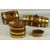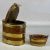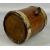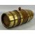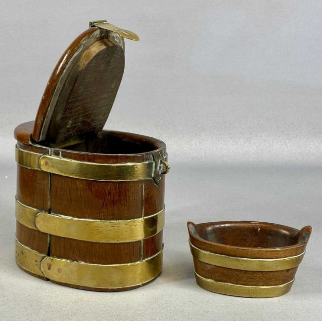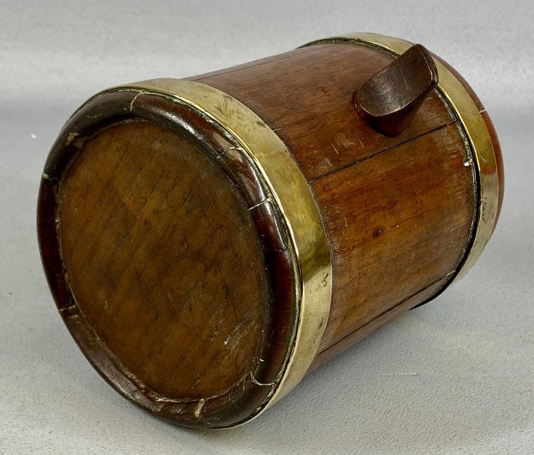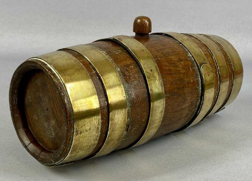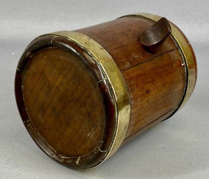 SMALL OVAL GEORGIAN MAHOGANY & COOPERED BRASS RUM BARREL, hinged cover with brass clasp, 14 (h) x 15 (w) x 12cms (d); another coopered brass barrel, 27cms (l); one other, 17cms (l); and a coopered brass and mahogany miniature balie, 6 (h) x 11 (w) x 7cms (d) (4)Provenance: private collection Gwynedd