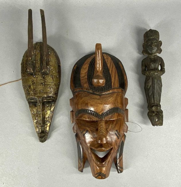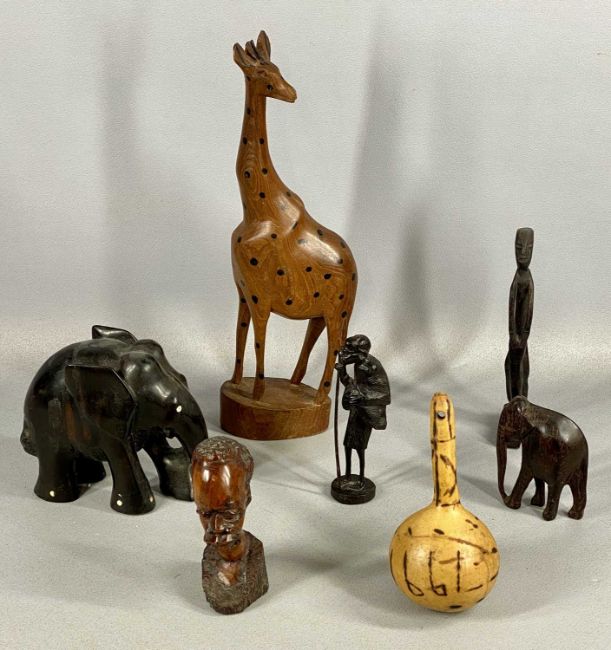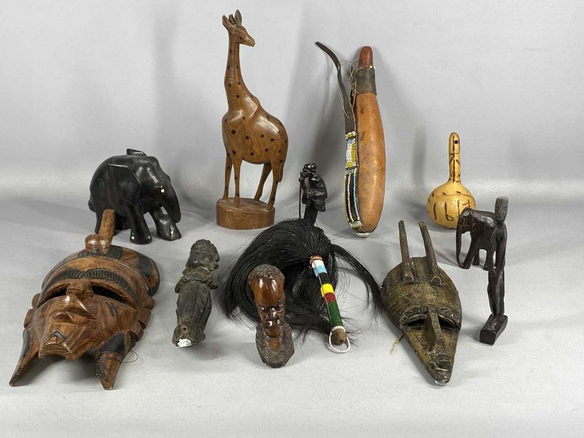 TRIBAL ART, including a hand-carved elephant mask, 36cms (h); Masai milk gourd with leather and beadwork mounts, 35cms (l); fly whisk with bead handle; various carved animals, etc.Provenance: private collection Ynys Môn