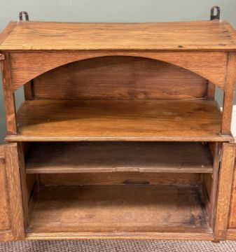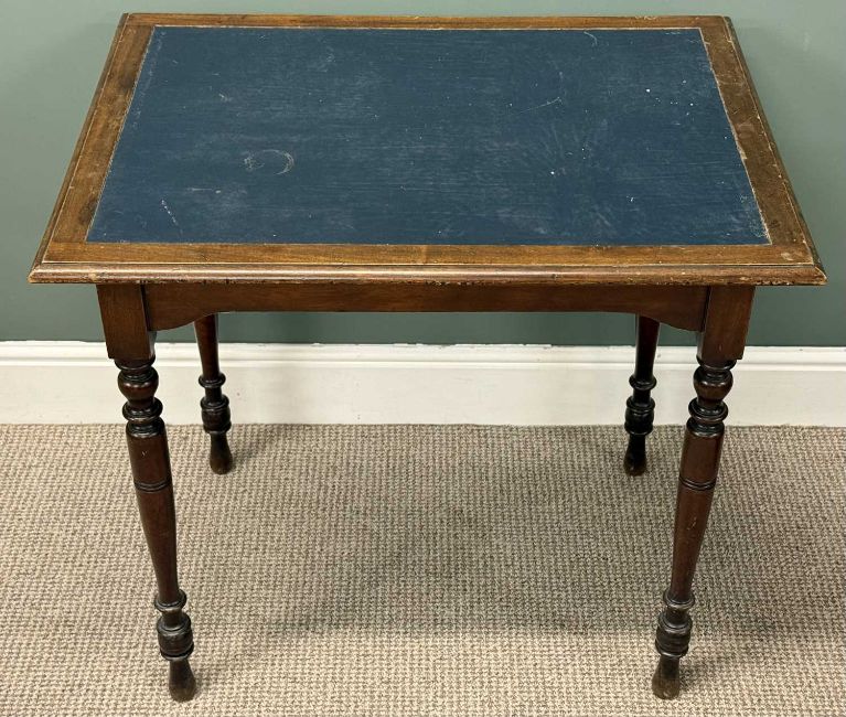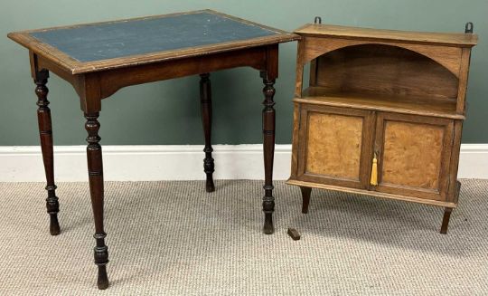 EDWARDIAN OAK TWO-DOOR WALL CUPBOARD, 75 (h) x 60 (w) x 26cms (d); and a mahogany centre table, rectangular top with inset writing surface, turned supports, 76 (h) x 82 (w) x 60cms (d)Provenance: private collection Conwy