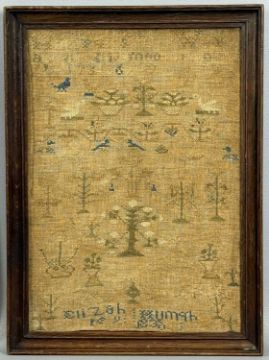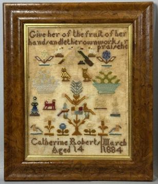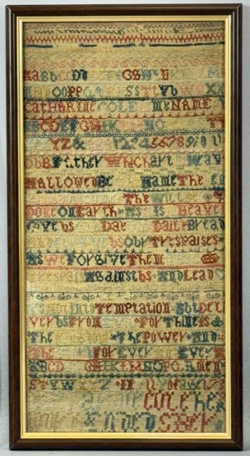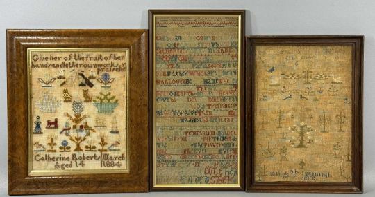 THREE VICTORIAN SAMPLERS, colourful woolwork example by Catherine Roberts, aged 14, dated 1884, 28 x 22cms; needlework with alphabet, birds, and trees, Elizabeth ?, 1838, 33 x 23cms; and needlework of the Lord's Prayer, Catherine Cole, undated, 14 x 19.5cms Provenance: private collection Ynys Môn