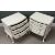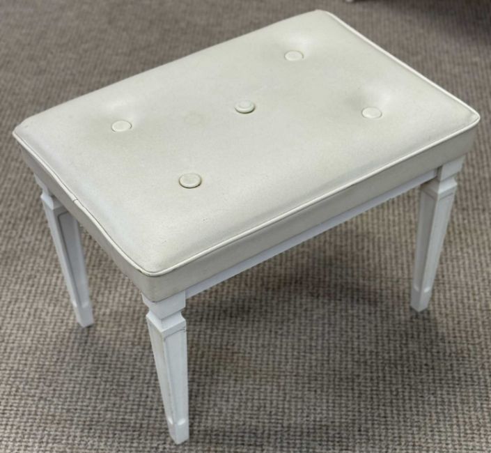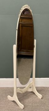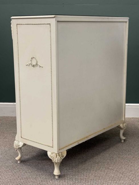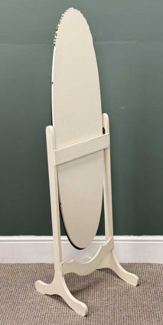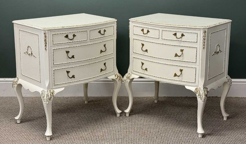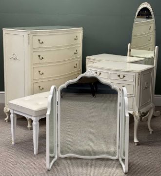 CREAM BEDROOM FURNITURE, five-drawer chest, 108 (h) x 93 (w) x 46cms (d); two three-drawer cabinets, 73 (h) x 66 (w) x 45cms (d); cheval mirror, 138 (h) x 40 (w) x 37cms (d); triple dressing table mirror, 79 (h) x 105 (w) x 25cms (d); and a five button top upholstered dressing table stool, 43 (h) x 61 (w) x 42cms (d)Provenance: private collection Shropshire