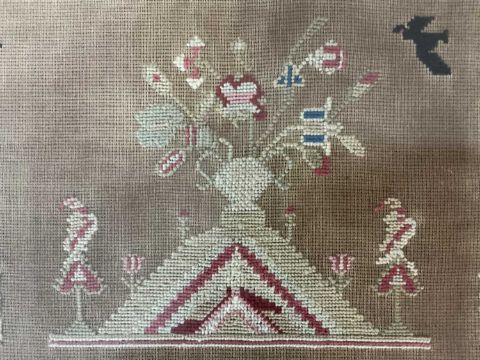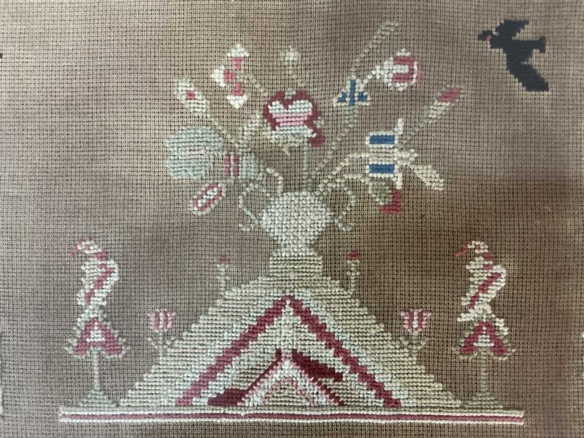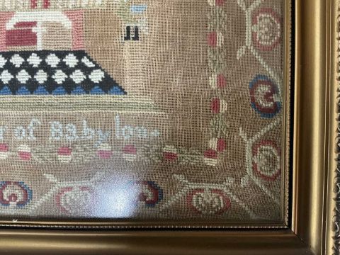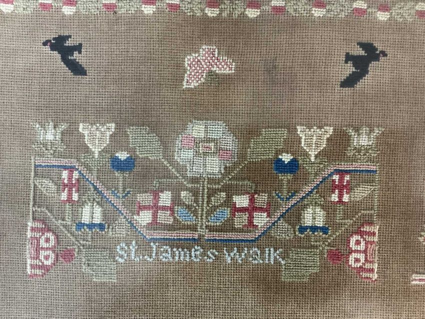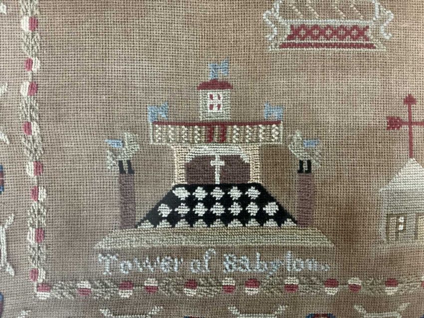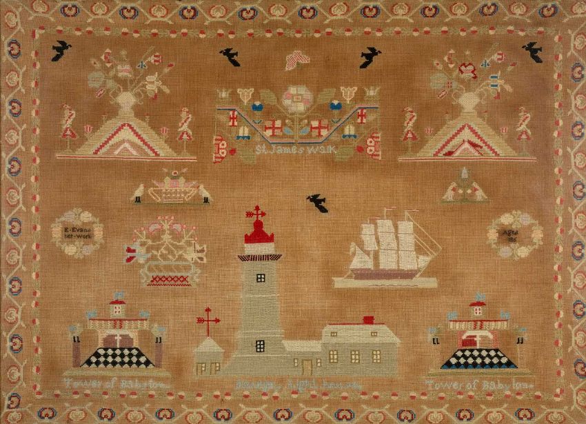 INTERESTING BELIEVED PORTHMADOG SAMPLER 1860s, worked with titled depictions of 'Bardsey Lighthouse', 'Tower of Babylon', and 'St James Walk' named for 'E. Evans her work' and dated '186' (last digit missing), age missing after 'Aged', also featuring a tall ship which is probably a 'Porthmadog Ship' built locally, together with five black birds, the tree of life and surrounding foliate meander, 61 x 85cmsProvenance: private collection Merseyside, Porthmadog family descentComments: framed and glazed, glazing cracked top right, some discolouration, see images