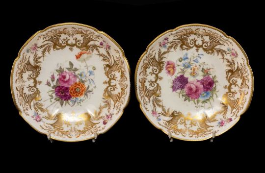 PAIR OF NANTGARW CRUCIFORM DESSERT DISHES, circa 1813-1820, painted with central spray of summer flowers, within elaborately gilded border incorporating small flower sprays, bold dentil border, impressed marks, 23.3cms (diam.) (2)Provenance: other dishes from this service in the Worcester Art Gallery collection, Massachusetts USA, part of the Mary Ellis collection; private collection CarmarthenshireComments: stacking wear to gilding, enamels good and bright