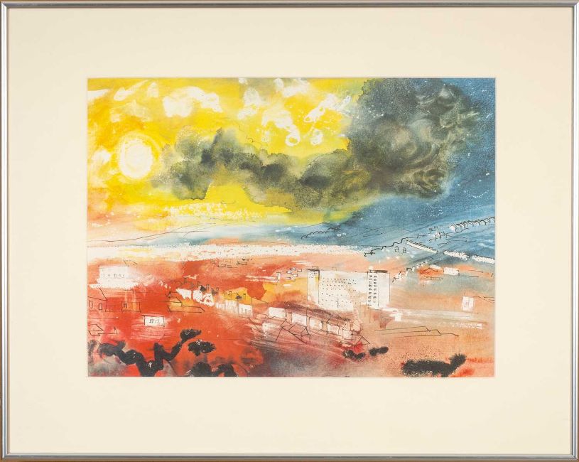 ‡ JOHN PIPER (1903-1992) offset lithograph - entitled 'Swansea Towards the Gower', 34 x 46cmsAuctioneer's Note: one of approx. 20 copies printed by Adrian Lack at the Senecio Press as spares for the Gwasg Gregynog ‘Deaths and Entrances’ by Dylan Thomas and subsequently sold with John Piper’s permission.Provenance: Bought from Gregynog by the present owner; private collection West MidlandsComments: framed and glazed