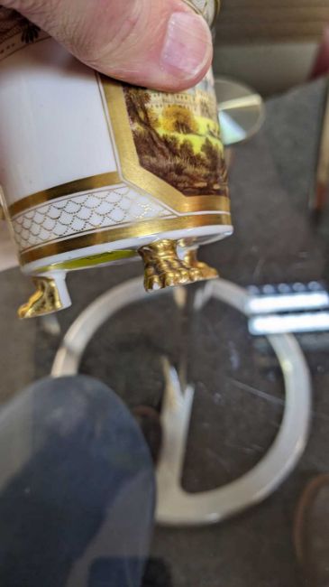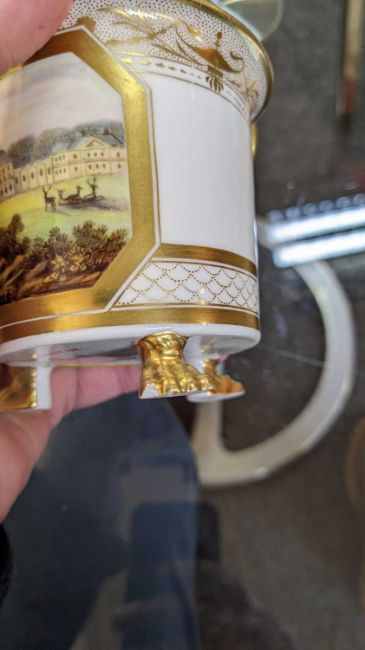 SWANSEA PORCELAIN CABINET CUP & ASSOCIATED STAND circa 1814-1820, topographical scenes to both, with titles to base, cup being 'Hurstbourne Park', stand with 'Basingwerk Abbey, Flintshire', cup with three gilded paw feet, elaborate gilded scroll handle with centre spindle and mask terminal to base, gilding lattice and stipple work, iron-red Swansea script marks to both, stand 16.5cms (diam.), cup 11cms (h)Provenance: deceased estate HampshireComments: stand is structurally fine, surface marks, slight losses to decoration and gilding, cup with small hairline in the interior from the handle (possibly from firing), small nick to paw feet
