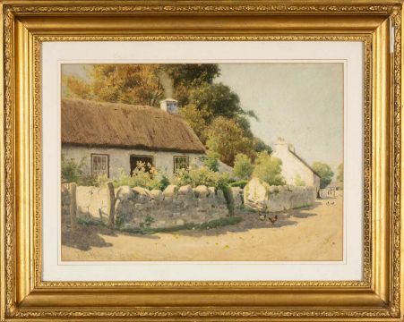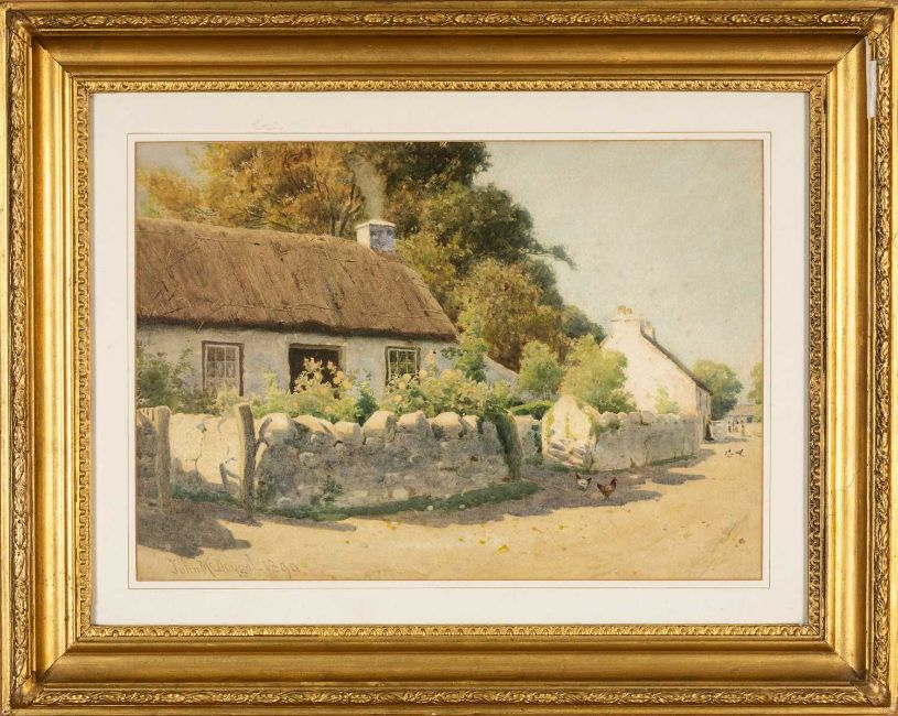 ‡ JOHN McDOUGAL (1852-1946) watercolour - thatched cottage with figures and feeding poultry, signed and dated 1890, 33 x 48cmsProvenance: private collection Ynys MônComments: frame has a little damage, framed, glazed