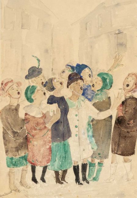 ‡ VERA BASSETT (1912-1997) watercolour - a group of ladies singing in the street, signed, 54 x 37cmsProvenance: private collection CardiffComments: framed, glazed