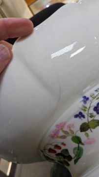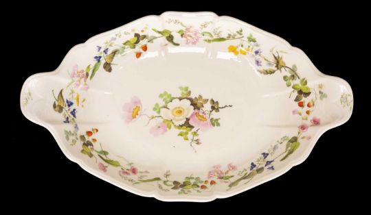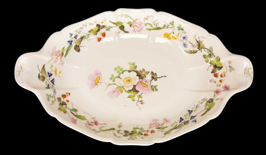 LARGE SWANSEA PORCELAIN OVAL CENTRE DISH circa 1814-1826, interior decoration trail of wildflowers and wild strawberries, centred posy, spreading oval foot with similar trail, fluted form, unmarked, 41cms (w) (handle to handle)Provenance: deceased estate HampshireComments: hairline crack to body of approx. 18cms