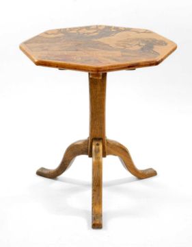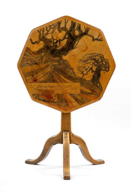 ‡ JOHN CLEAL (1929-2007) octagonal tilt-top table,tripod oak base with triangular section column, table top with leather covered chip-board, decorated with trees and inscribed with the Bible verse from the book of Kells, 'Bonus Homo De Bono, Thesauro Profert Bono/ A Good Man From a Good Treasure Brings Forth Good Things', signed verso and numbered 525 on registration card, 62cms (diam.)Provenance: private collection CardiffComments: some staining to the leather top