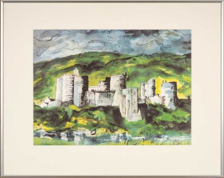 ‡ JOHN PIPER (1903-1992) offset lithograph - entitled 'Kidwelly Castle', 34 x 46cmsAuctioneer's Note: one of approx. 20 copies printed by Adrian Lack at the Senecio Press as spares for the Gwasg Gregynog ‘Deaths and Entrances’ by Dylan Thomas and subsequently sold with John Piper’s permission.Provenance: Bought from Gregynog by the present owner; private collection West MidlandsComments: framed and glazed