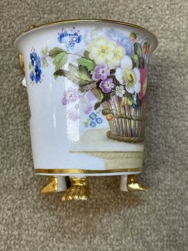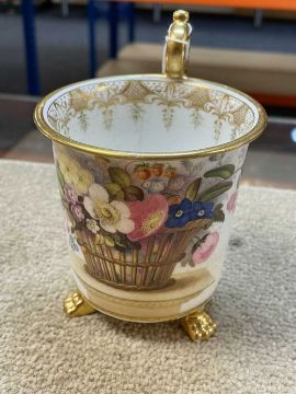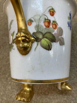 RARE SWANSEA PORCELAIN CABINET CUP circa 1814-1826, painted by Henry Morris in the duck-egg paste, the cylindrical body on three paw feet, scrolling handle having a mask terminal, feet and handle picked out in gold and with solid gilt rims to foot and mouth, exterior decorated with a basket of overflowing wildflowers and strawberries seated on a plinth, reverse with further flowers and strawberries, iron-red stencilled Swansea mark to base, 12cms (h)Provenance: deceased estate HampshireAuctioneer's Notes: Cf. Bonhams lot 277, 18 Apr 2012 sale for similarly decorated cup and saucer. The same design of a basket of flowers is also found on the Lysaght service, mostly painted by Henry Morris and probably made during the Bevington period.Comments: cracked body, glaze with extensive minute bubble imperfections.