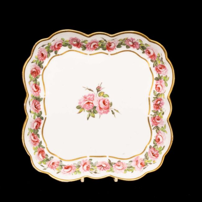 NANTGARW PORCELAIN SQUARE DISH circa 1813-1820, lobed form, border with trail of open pink roses amongst leaves, centred posy of roses, gilt rim, impressed Nantgarw CW, 24cms²Provenance: deceased estate HampshireComments: fine condition, wear to gilding only