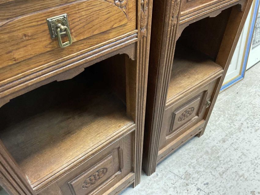 PAIR CONTINENTAL MARBLE TOP BEDSIDE CABINETS, carved oak and reeded frames, 84 (h) x 40cms (sq.)Provenance: consigned via West WalesComments: one cabinet missing cupboard base, general wear/bumps, overall good, inspection advised