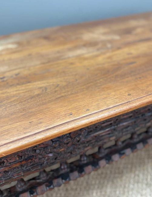 ANGLO-INDIAN CARVED LOW TABLE, probably teak, 41 (h) x 166 (w) x 78cms (d)Provenance: consigned via West WalesComments: table top stained and faded, some frieze decorations damaged/missing, inspection advised