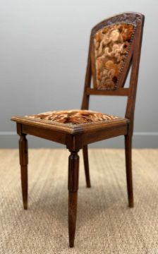 FOUR EARLY 20TH C. CONTINENTAL CARVED OAK ART DECO SALON CHAIRS, 99 (h) x 48cms (w)Provenance: private collection Vale of GlamorganComments: good used condition, some wear/fade, inspection advised