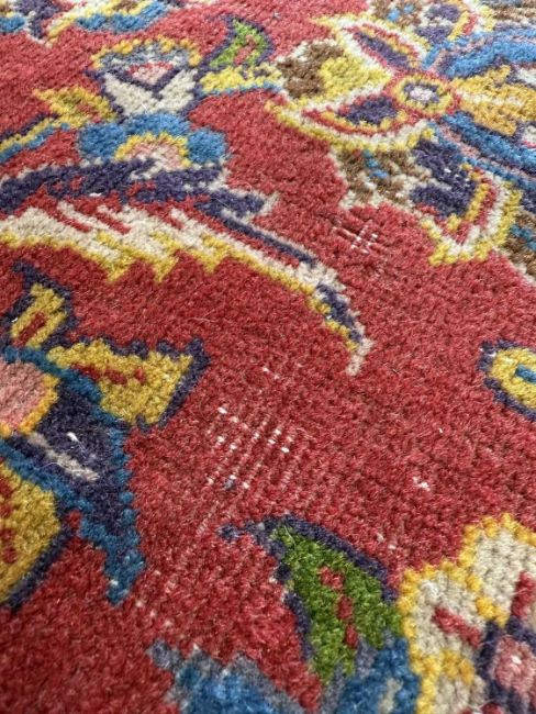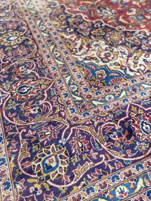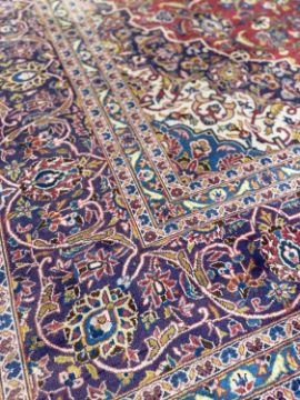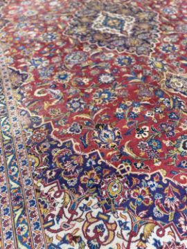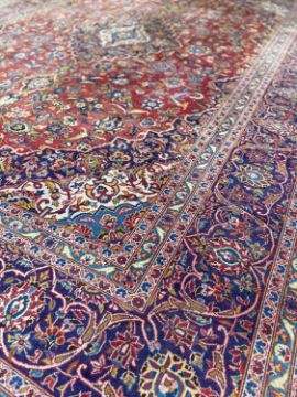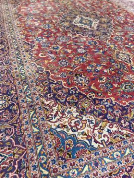 KASHAN MAIN CARPET, central lozenge medallion on a madder field, stepped spandrels, palmette border, 415 x 300cmsProvenance: private collection PowysComments: general wear and fade, overall good, inspection advised