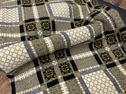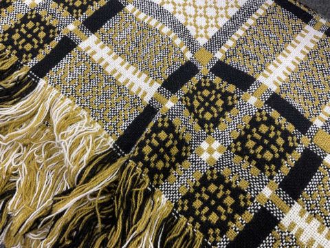 VINTAGE TRADITIONAL WELSH WOOLEN BLANKET with yellow, black and white geometric design, with corresponding three colour fringe, 236 x 157cmsProvenance: private collection CarmarthenshireComments: looks fine, no holes