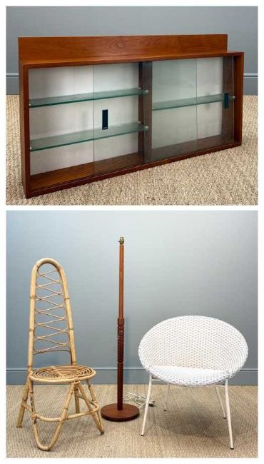 SELECTION OF 'RETRO' FURNITURE including white 'Lusty' Lloyd Loom circular chair, high-back bamboo & cane chair, 114cms (h), teak & glass medicine cabinet, 49.5 (h) x 91cms (w) x 12cms (d), wooden standard lamp, 130cms (h) (4)Provenance: consigned via West WalesComments: cabinet glass sliding door chipped. others good, inspection advised