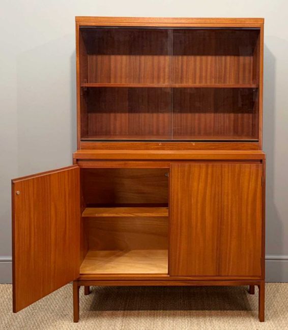 MID-CENTURY STYLE SOLID TEAK CABINET, upper section with glass sliding doors & adjustable wooden shelf, lower with two cupboards, rhs with full-depth adjustable wooden shelf, lhs with half-depth adjustable wooden shelf, 163 (h) x 102 (w) x 43cms (d)Provenance: consigned via West WalesComments: good used condition, minor scratches/stains, currently one piece & quite heavy, no manufacturers label, inspection advised