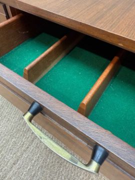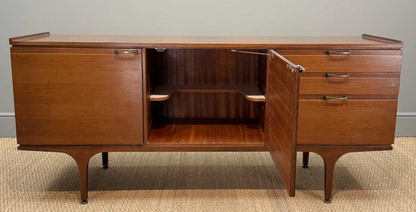 MID-CENTURY MEREDEW TEAK SIDEBOARD, central drinks cabinet with melamine-topped U-shaped shelf flanked by drawers to the right, upper with cutlery tidy, and cupboard to the left, metal handles, 74 (h) x 165 (w) x 45cms (d)Provenance: consigned via West WalesComments: light signs of use/wear, overall very good, inspection advised