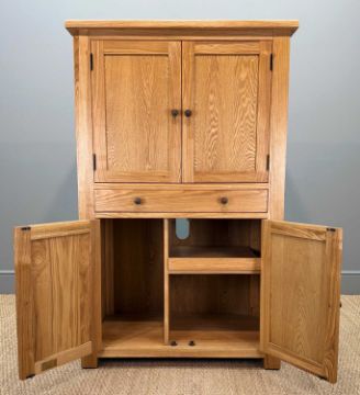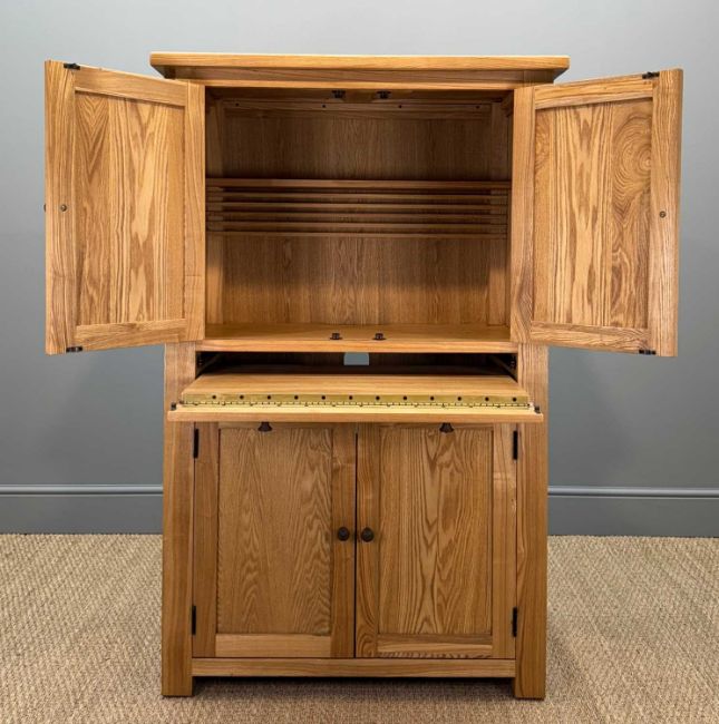 MODERN SOLID OAK 'HIDEAWAY' COMPUTER DESK/STATION, pull-out keyboard shelf, cupboards below for tower storage and pull-out printer tray, 147 (h) x 93 (w) x 55cms (d)Provenance: consigned via West WalesComments: good used condition, inspection advised