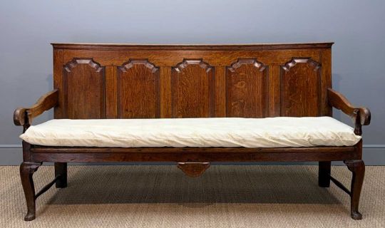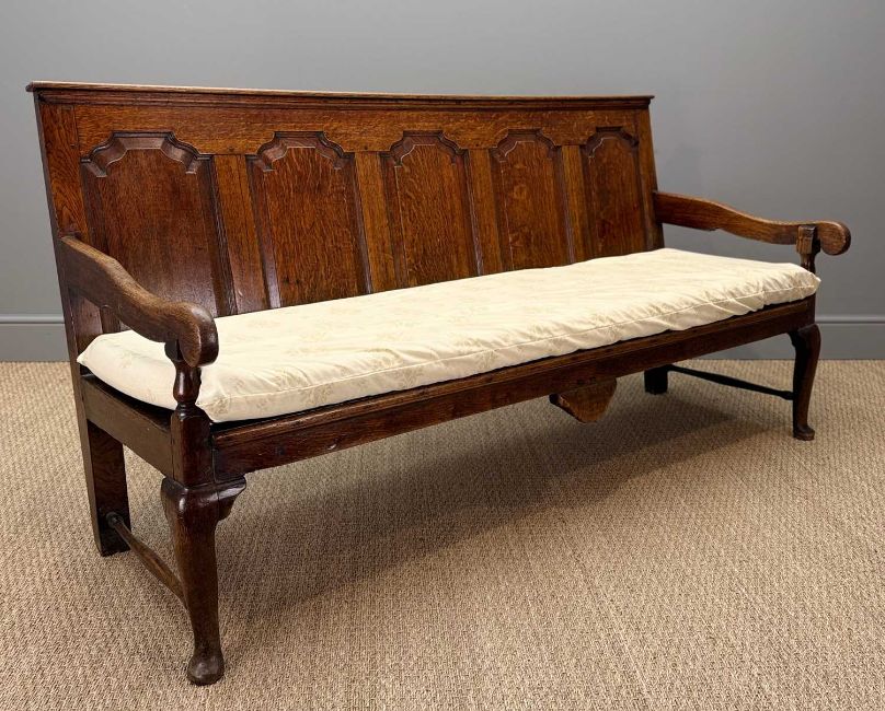 18TH C. OAK SETTLE, five fielded panels, slatted seat with cushion over, 98 (h) x 190 (w) x 75cms (d)Provenance: private collection Vale of GlamorganComments: repairs, restorations and alterations, rear legs reduced, splits, central leg missing, inspection advised