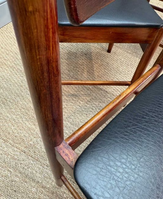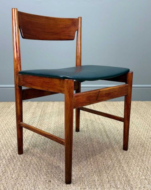 FOUR MID-CENTURY TEAK DINING CHAIRS, possibly Elliots of Newbury, together with two mid-century mirrors (6)Provenance: consigned via West WalesComments: chairs crudely stained/varnished, black leatherette seat pads good, inspection advised
