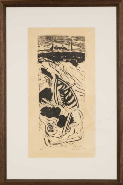 ‡ KIM ATKINSON limited edition (1/50) plywood print - entitled 'Stormy Seas and Boat Wreck', signed and dated 1999, 43 x 18cmsAuctioneer's Note: Part of a set of woodcuts used as illustrations for the book 'Tomos o Enlli' by Jennie Jones, Gwasg Carreg GwalchProvenance: private collection West MidlandsComments: framed and glazed