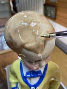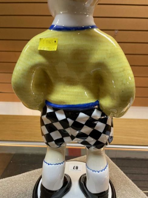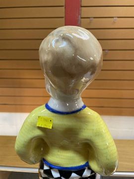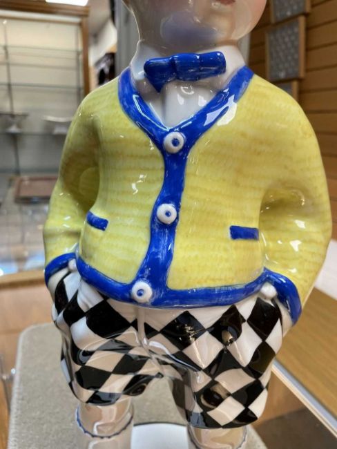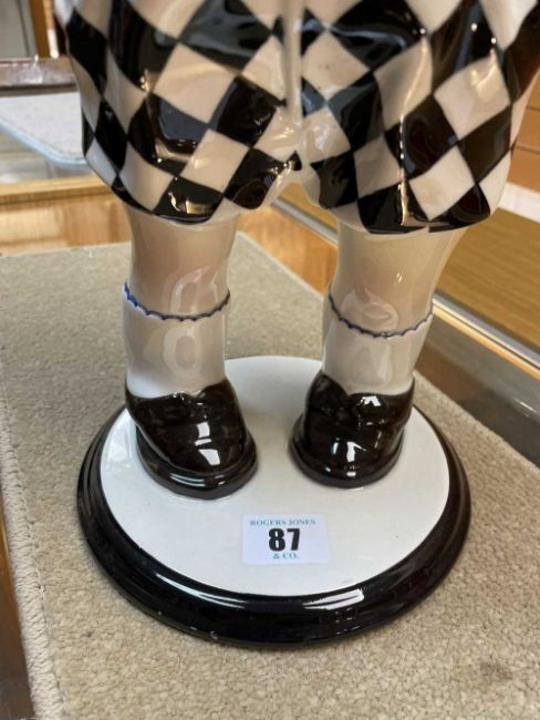 SANDRO VACCHETTI (1889-1974) FOR LENCI, large rare ceramic figure of a standing boy in cardigan, bow tie and checkered shorts, marked to base 'Lenci', 'Made In Italy', and 'Torino', 43cms (h)Provenance: private collection CeredigionComments: tiny glaze chip to hair, otherwise very good, viewing recommended