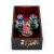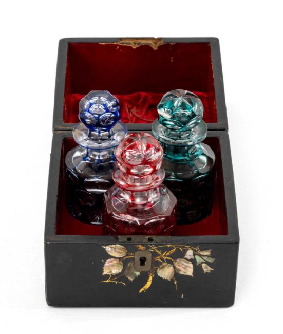 CHINOISERIE BOXED SET OF BOHEMIAN CASED GLASS SCENT BOTTLES, in red, green, and blue overlay, each bottle 10cms, in box 12.5 x 12.5cmsProvenance: private collection Rhondda Cynon TafComments: box worn and with damaged hinges, foot of blue glass bottle with chip