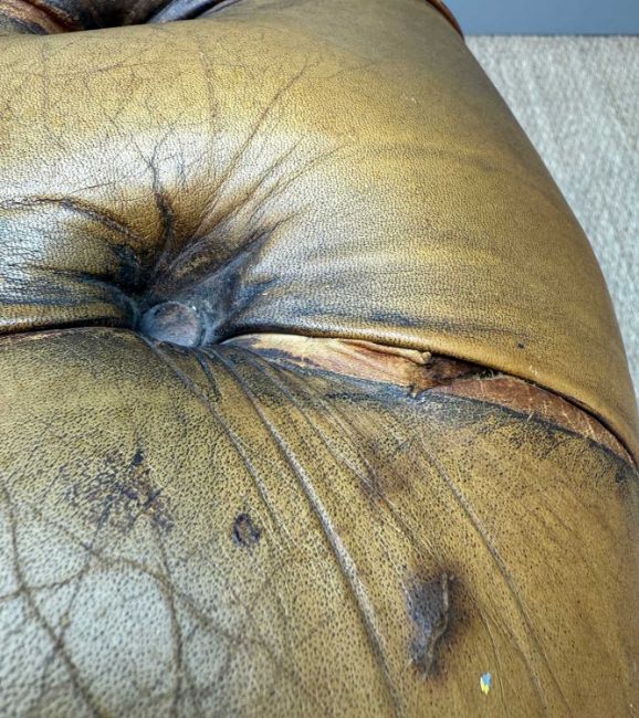 19TH C. STYLE CHESTERFIELD ARMCHAIR, tan leather, double button border, 74 (h) x 105 (w) x 95cms (d)Provenance: private collection CardiffComments: overall stains/wear/soiled, seat buttons missing, some pleats loose/damaged, inspection advised