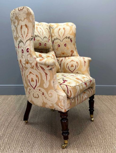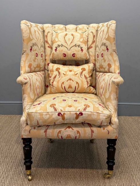 GEORGE III STYLE BARREL BACK ARMCHAIR, reeded tub back, floral cloth upholstery, turned front legs on modern castors, separate loose cushion and backrest, 111 (h) x 74cms (w)Provenance: private collection LondonComments: good overall condition, normal wear, inspection advised