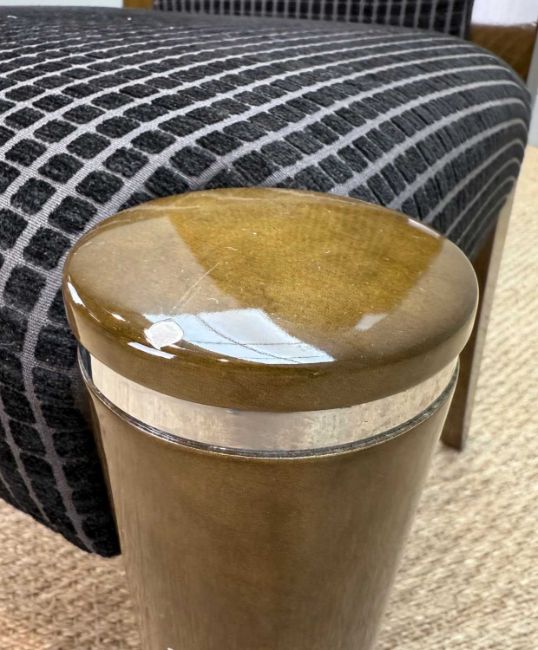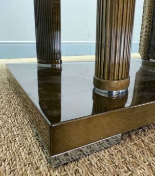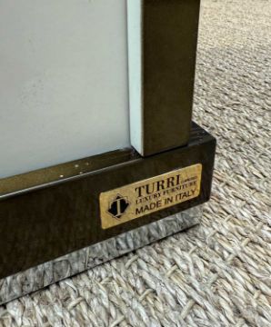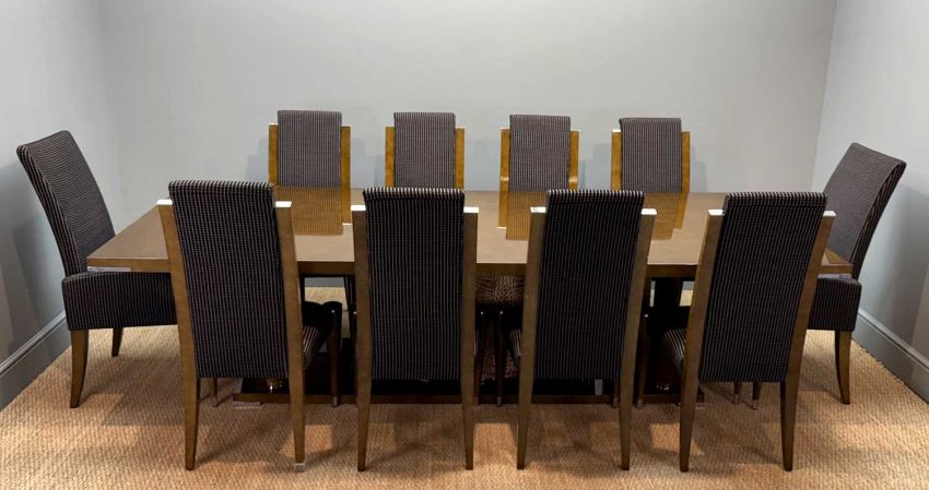 CONTEMPORARY ITALIAN TURRI DINING SUITE comprising, large high-gloss lacquered brown dining table, chrome accents, supported at each corner by oval, reeded columns & larger central oval column part-covered in embossed leather, standing on similar plinth with chrome feet, 75 (h) x 280 (w) x 120cms (d), ten upholstered dining chairs inc. two carvers with decorative lacing to rear, 110cms (h), associated sideboard, central reeded half-column, 86 (h) x 230 (w) x 51cms (d) (12)Provenance: private collection PembrokeshireComments: table top light scratches and a few small chips, top currently loose from base and screws provided, chair upholstery good, one or two small chips to frames, overall very good, sideboard with light scratches from normal use, inspection advised, very heavy and large, minimum two person to collect and suitable transport