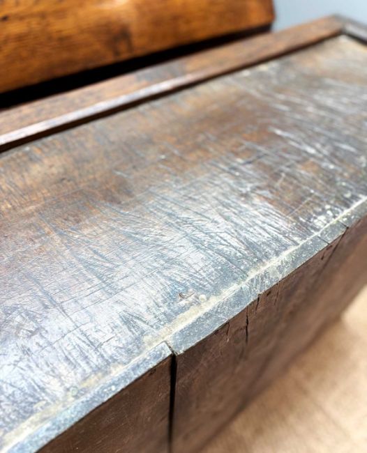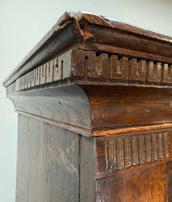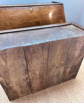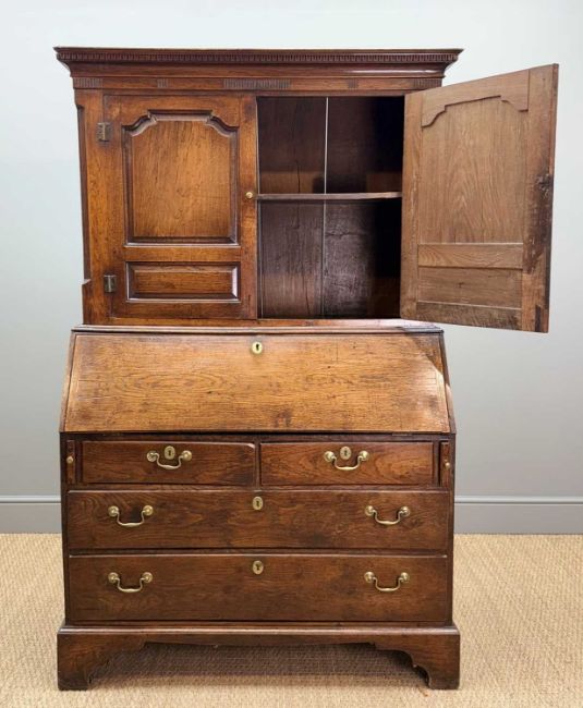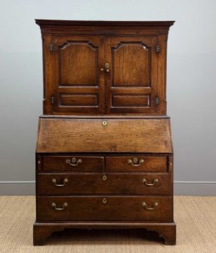 LATE 18TH. CARMARTHENSHIRE OAK BUREAU CABINET, upper with dentil cornice, fluted detail to frieze and canted corners, fielded panels, drop-front, fitted interior with fluted detail, two short over two long drawers, raised on bracket feet, 187 (h) x 105 (w) x 61cms (d)Provenance: deceased estate Monmouthshire, previously purchased direct from Richard Bebb and features in his book, Welsh Furniture 1250-1950 page 148 image 924Comments: overall good colour and condition, old repairs, small piece of rear bracket foot missing, viewing recommended